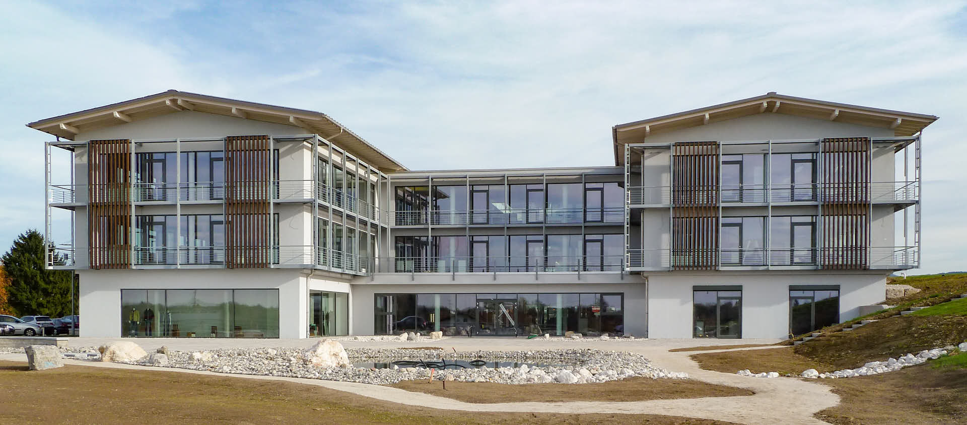 Das Gebäude überzeugt durch seine offene, helle und architektonisch klare Gestaltung. Großzügige Glasflächen, eine moderne Linienführung und die präzise Ausführung der Fassadenelemente verleihen dem Objekt eine hochwertige, freundliche und zeitlose Ausstrahlung. Gerade bei Gebäuden mit repräsentativem Anspruch spielt die Kombination aus Funktionalität, Haltbarkeit und gestalterischer Qualität eine entscheidende Rolle.